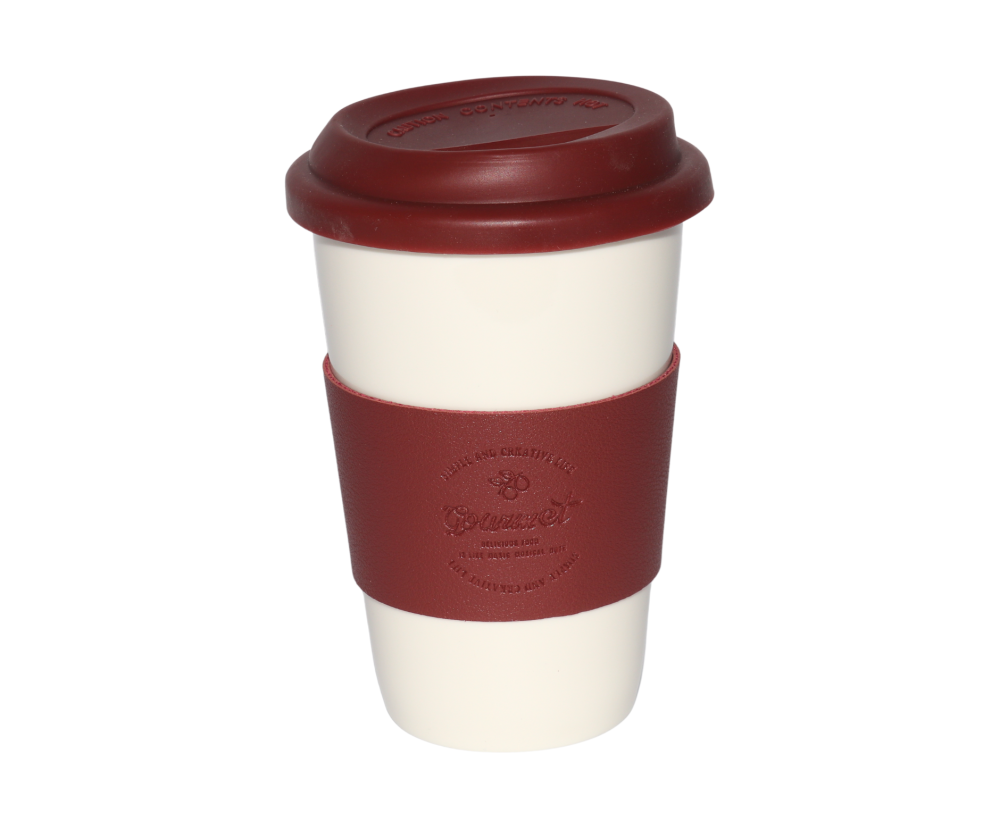 كوب سيراميك فاخر مزود بغطاء من السليكون ومقبض جلد