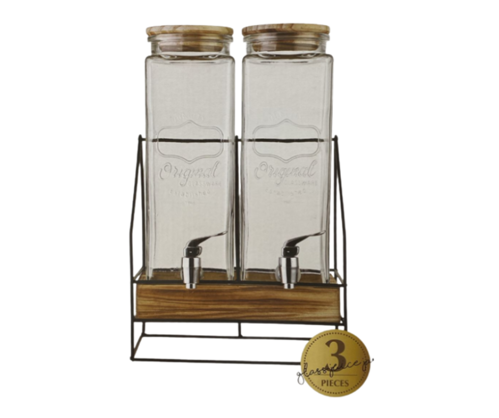 جك عصير زجاج ثنائي مع ستاند من الخشب والمعدن