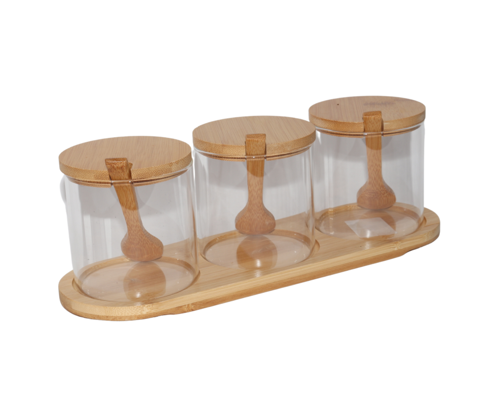 3 علب بهارات زجاج مع ملاعق خشبية ومزودة بغطاء خشبي