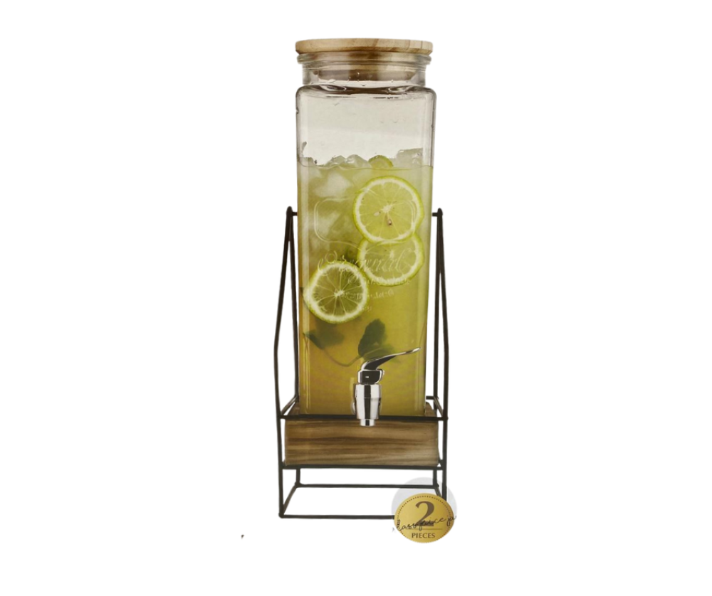 جك عصير زجاج مع ستاند من الخشب والمعدن